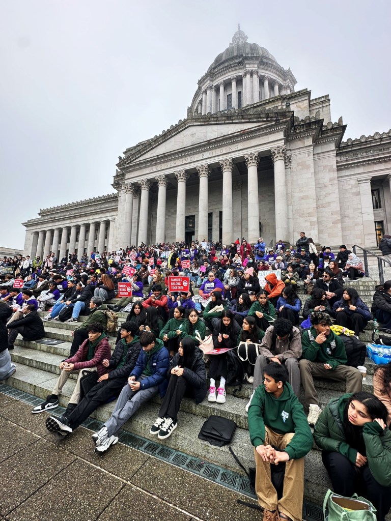 当天,在华盛顿州议会大厦宏伟的圆顶下,奥林匹亚的台阶被充满活力的色彩与多元的族裔面孔所占据。现场气氛热烈非凡,来自Clover Park高中、Lincoln高中等学校的年轻学子们与各界社区倡导者并肩而立,形成了一股不可忽视的声浪。人群中不时爆发出热情的欢呼,这种“挤满了人”的盛况展现了亚太裔社区(AANHPI)在维护移民权益、推动医疗扩张及税收改革等“团结议程”上的高度一致与力量感。