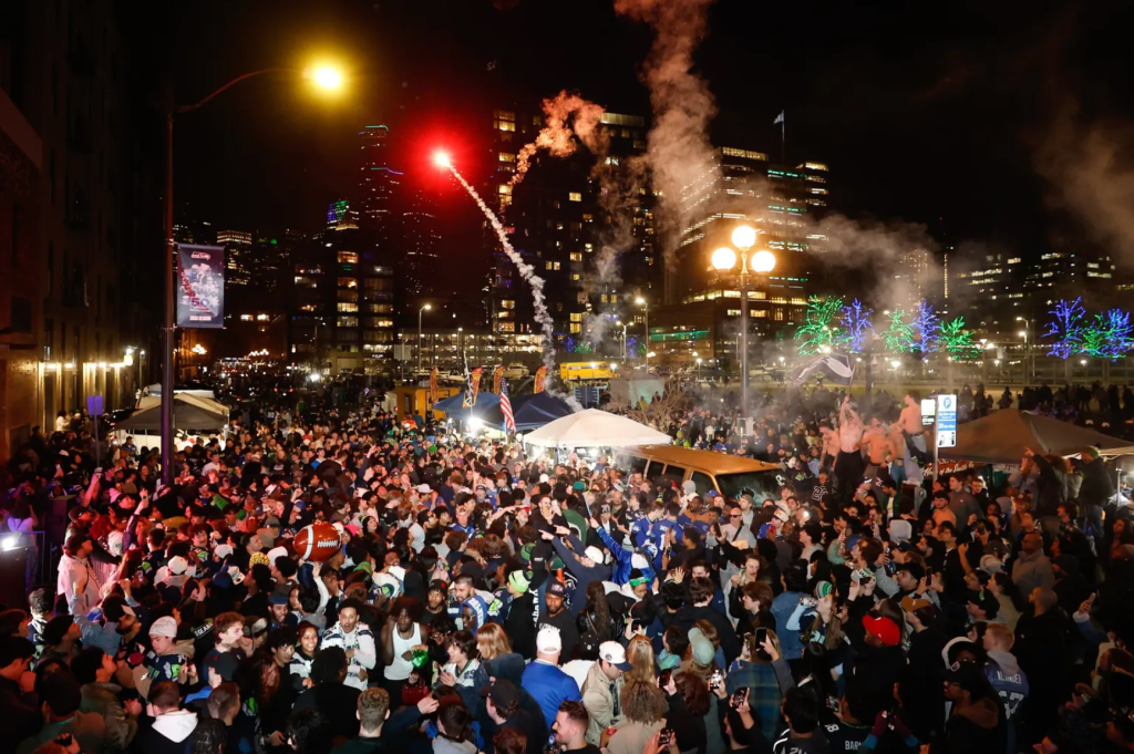 周日晚,在Lumen Field外庆祝的海鹰队球迷