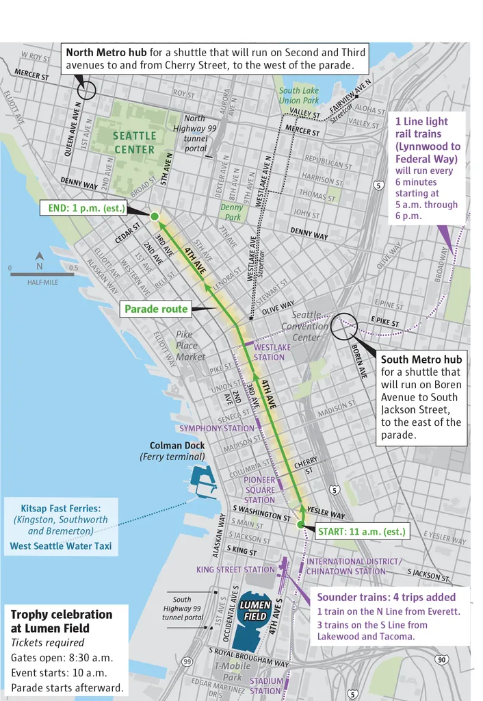 根据安排,周三上午10点,Lumen Field将先举行奖杯庆典,隆巴迪杯会在现场展示,球场8点30分开门入场。庆典需要门票,而游行本身不设门票;截至周一上午,庆典门票在票务平台上已显示售罄。入场时将执行球场的携包规定:只允许透明背包、透明手提袋、小手包或密封袋等;酒精、自拍杆、号角、运动相机等物品在禁带之列。