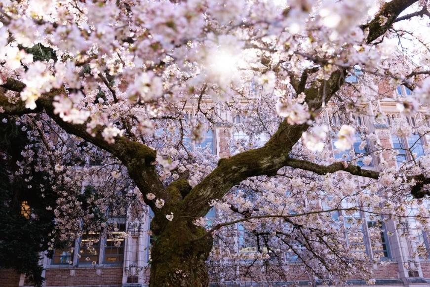 华盛顿大学校园内,四方庭院的29棵吉野樱树预计将于本周五达到盛花期,届时约70%的粉色花朵将同时开放。华大研究人员表示,往年的平均盛花期为3月23日,而今年提前近一周。想提前掌握花开进度的读者,可点击访问华大官网查看校园樱花的实时直播画面。