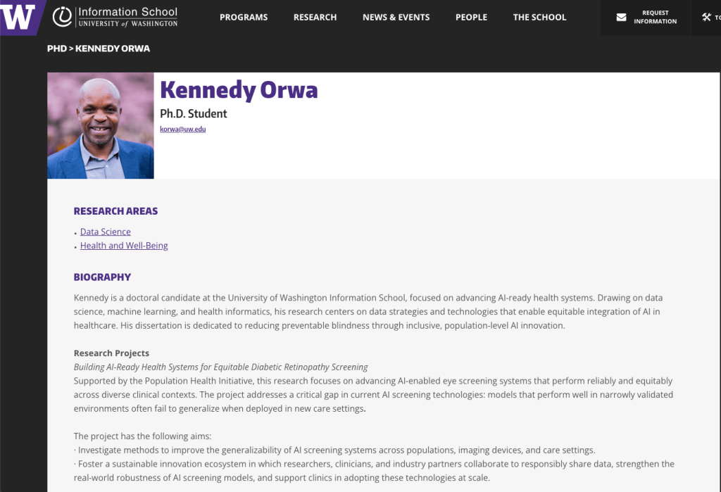 根据华盛顿大学信息学院的公开资料,奥瓦是一名博士研究生,研究方向为利用人工智能技术改善公共卫生系统。他的学术背景涵盖机器学习、人工智能政策、数据战略、医疗健康和数字创新等多个领域。