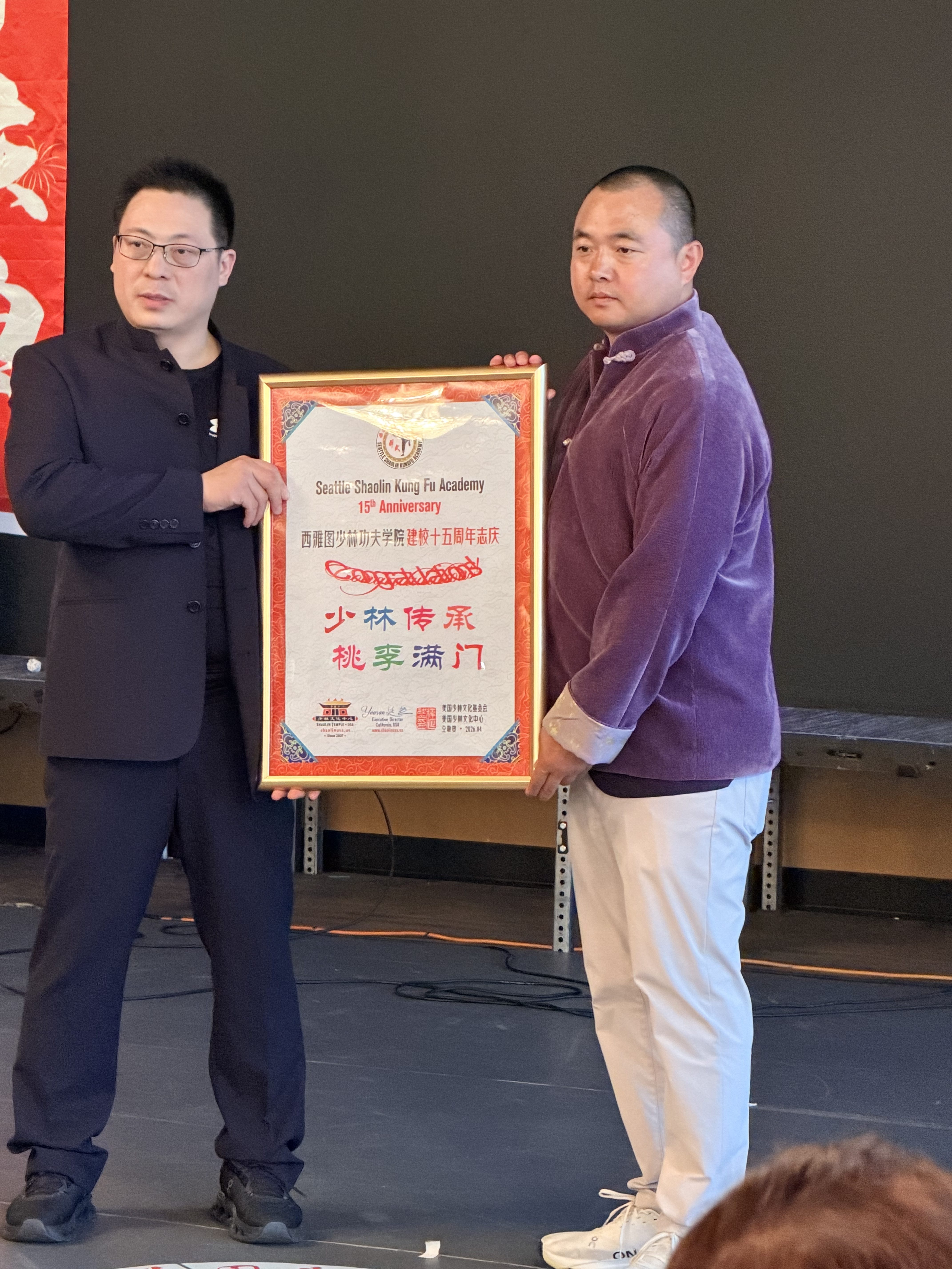 【西雅图中文电台报道,记者:小元,摄像:张欣欣】在大西雅图地区春意渐浓之际,一场融合中华武术精髓与海外文化交流的盛会悄然拉开帷幕。西雅图少林功夫学院迎来了成立十五周年的重要时刻,以一场气势恢宏的功夫专场演出和一场温馨隆重的周年庆典晚宴,向社区展示其多年来深耕武术教育、弘扬中华文化的成果与情怀。华盛顿州参议员长谷川(Bob Hasegawa)参加了庆典,华盛顿州州长Bob Ferguson, 华盛顿州副州长Denny Heck,美国国会议员Maria Cantwell、美国国会议员Adam Smith,西雅图市长凯蒂.威尔逊等为庆典发来了贺信。